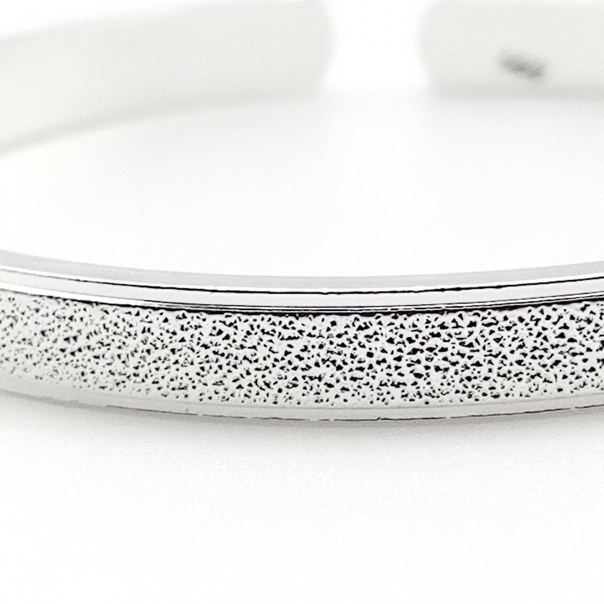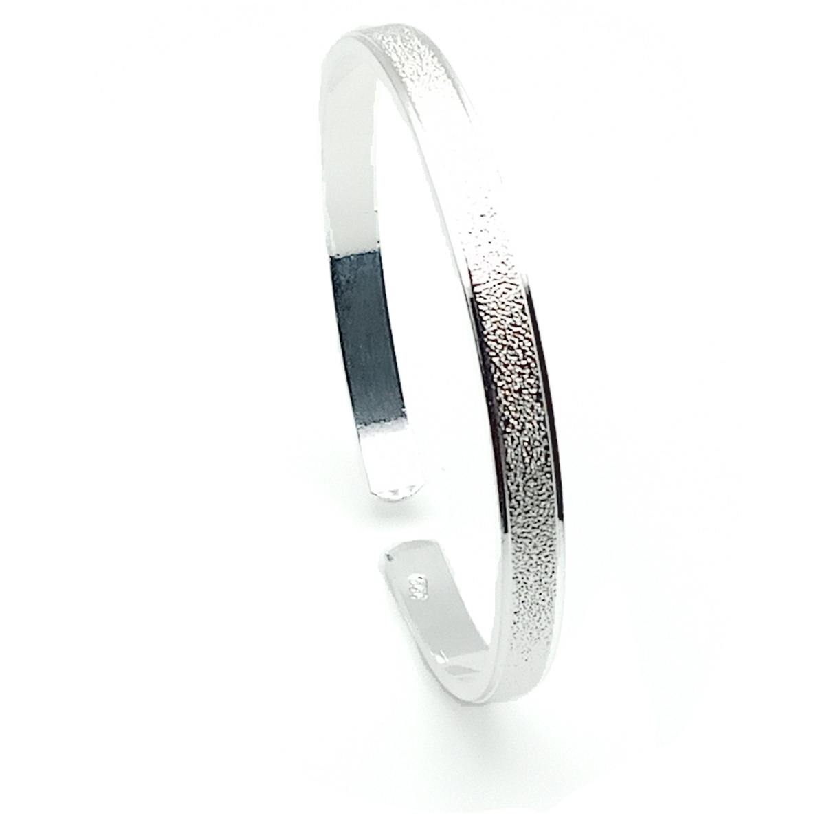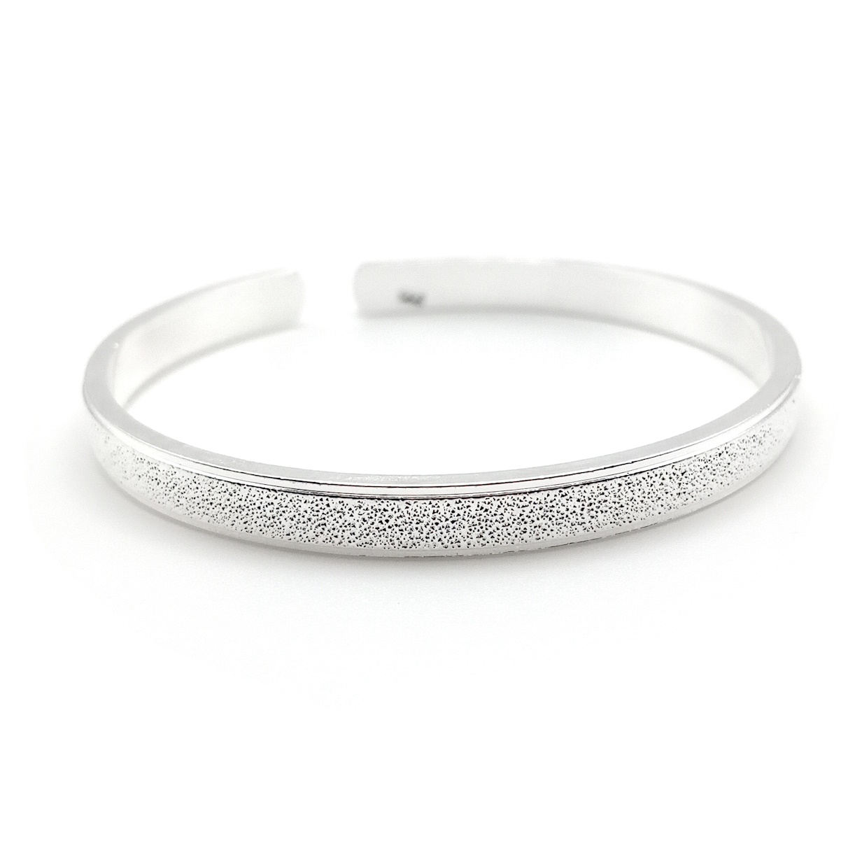 Elevate your look with a touch of modern sophistication. This sterling silver bangle is a true statement piece, featuring a substantial 10mm width that commands attention. The top surface is expertly finished with a unique stippled texture, creating a captivating matte sparkle that beautifully contrasts with the smooth, highly polished edges.