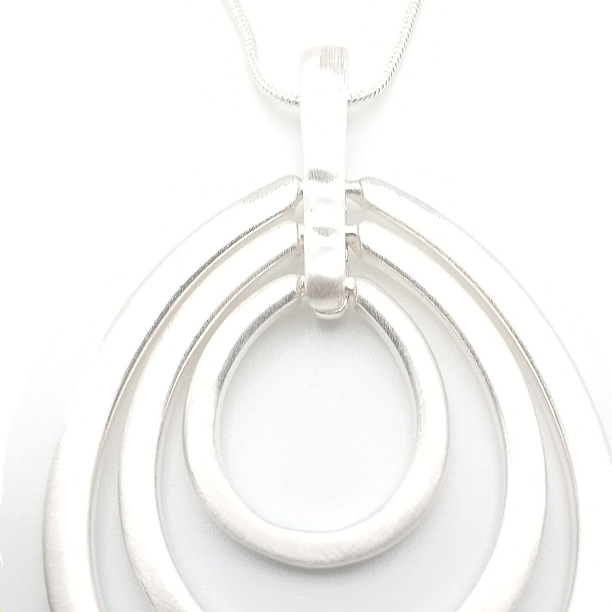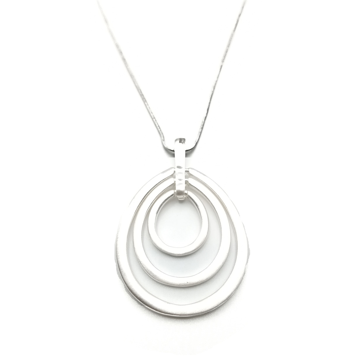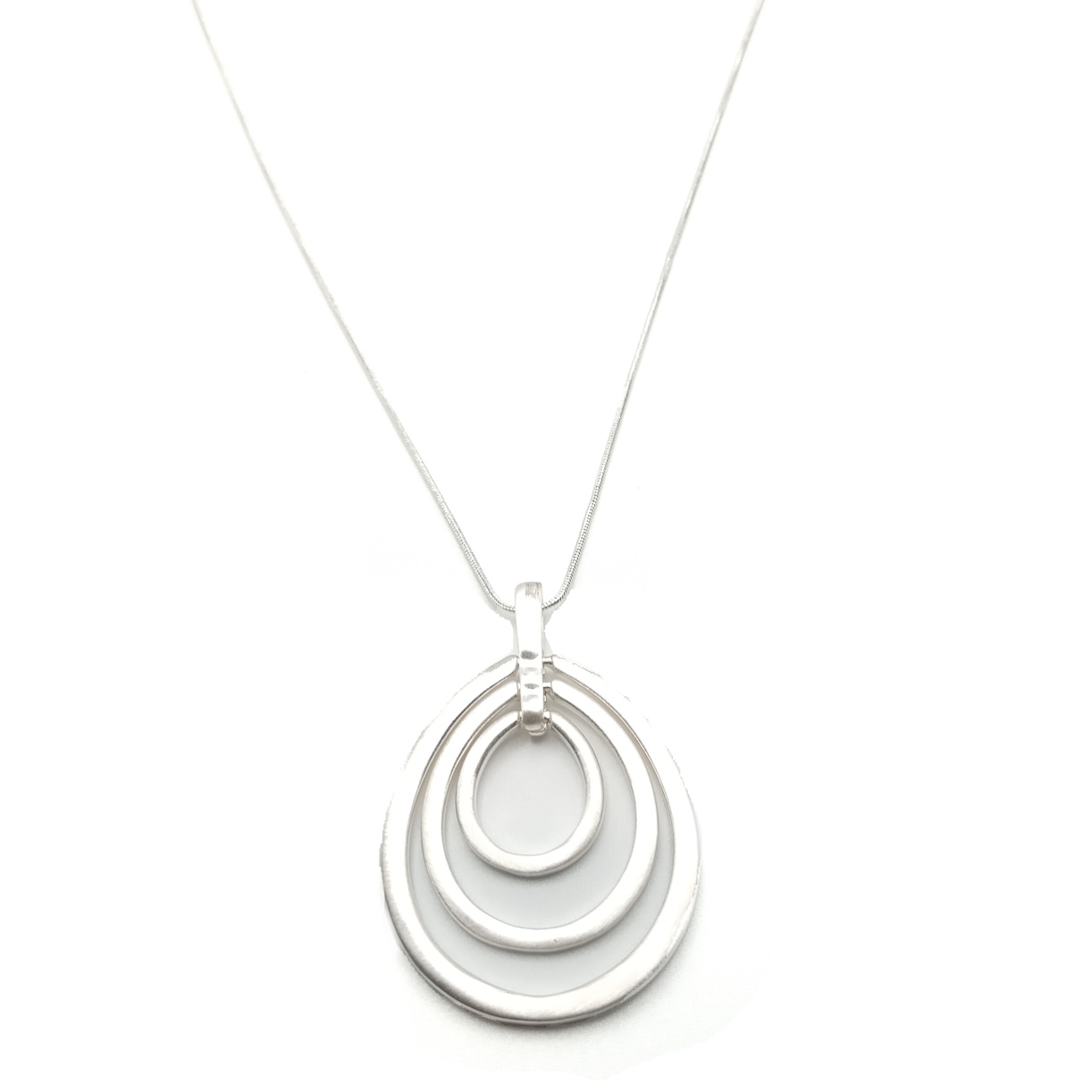 Elevate your look with this captivating necklace, a true masterpiece of minimalist design. This elegant piece features a long, luxurious silver-plated snake chain, designed to drape gracefully at a versatile 31-inch length. Its sleek and fluid form provides a perfect backdrop for the striking pendant, a contemporary trio of concentric oval shapes.