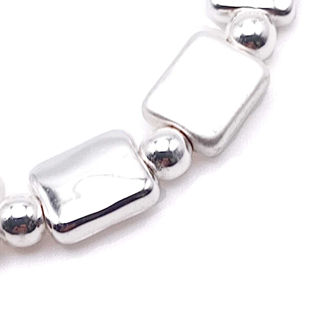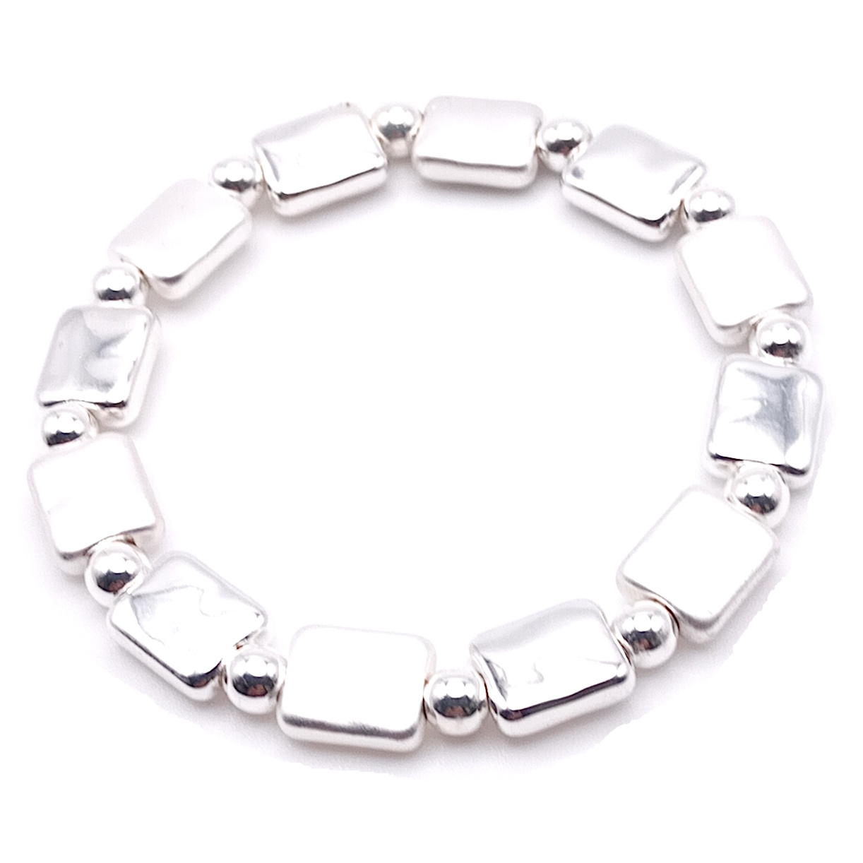 Discover a bracelet that seamlessly blends strength with sophistication. Crafted with a durable, stretchy elastic, this piece offers both a comfortable and secure fit for all-day wear. The design is a study in texture, featuring a series of robust, puffed oblong beads that alternate between a brilliant, polished silver-plated finish and a cool, matte silver-plated surface.