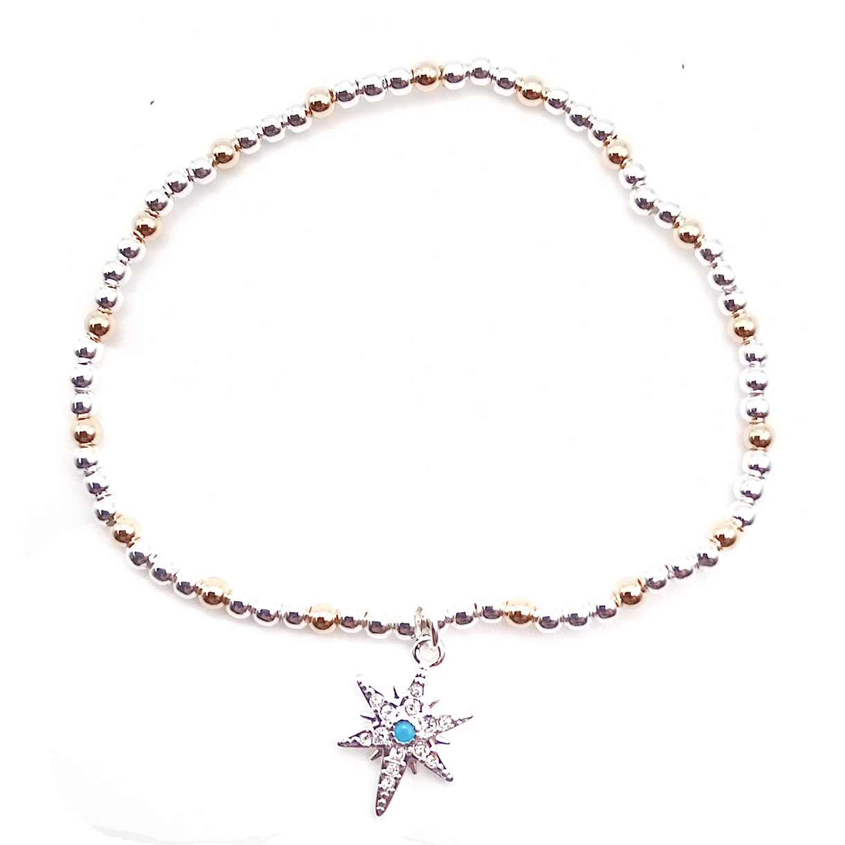 The true centerpiece is the stunning wintery star charm. Its textured surface catches the light from every angle, while a captivating blue gemstone at its heart evokes the deep, enchanting hue of a winter night sky. This bracelet isn't just an accessory; it's a personal piece of the cosmos, ready to add a touch of magic to your everyday style.