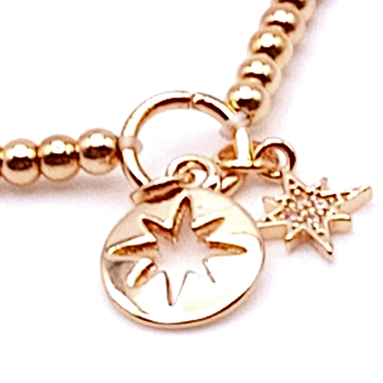 Adorning this piece are two charming symbols of guidance and hope: a small, intricately cut-out disc featuring an 8-point Star of Bethlehem, and a second, smaller 8-point star charm. The star, a timeless symbol of direction and light, makes this bracelet more than just an accessory—it's a meaningful reminder of your journey. The cohesive yellow gold finish provides a warm, classic look that complements any outfit.