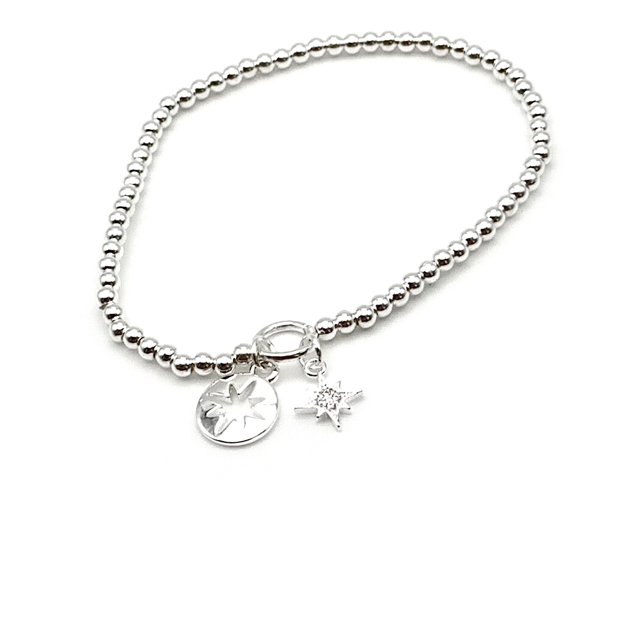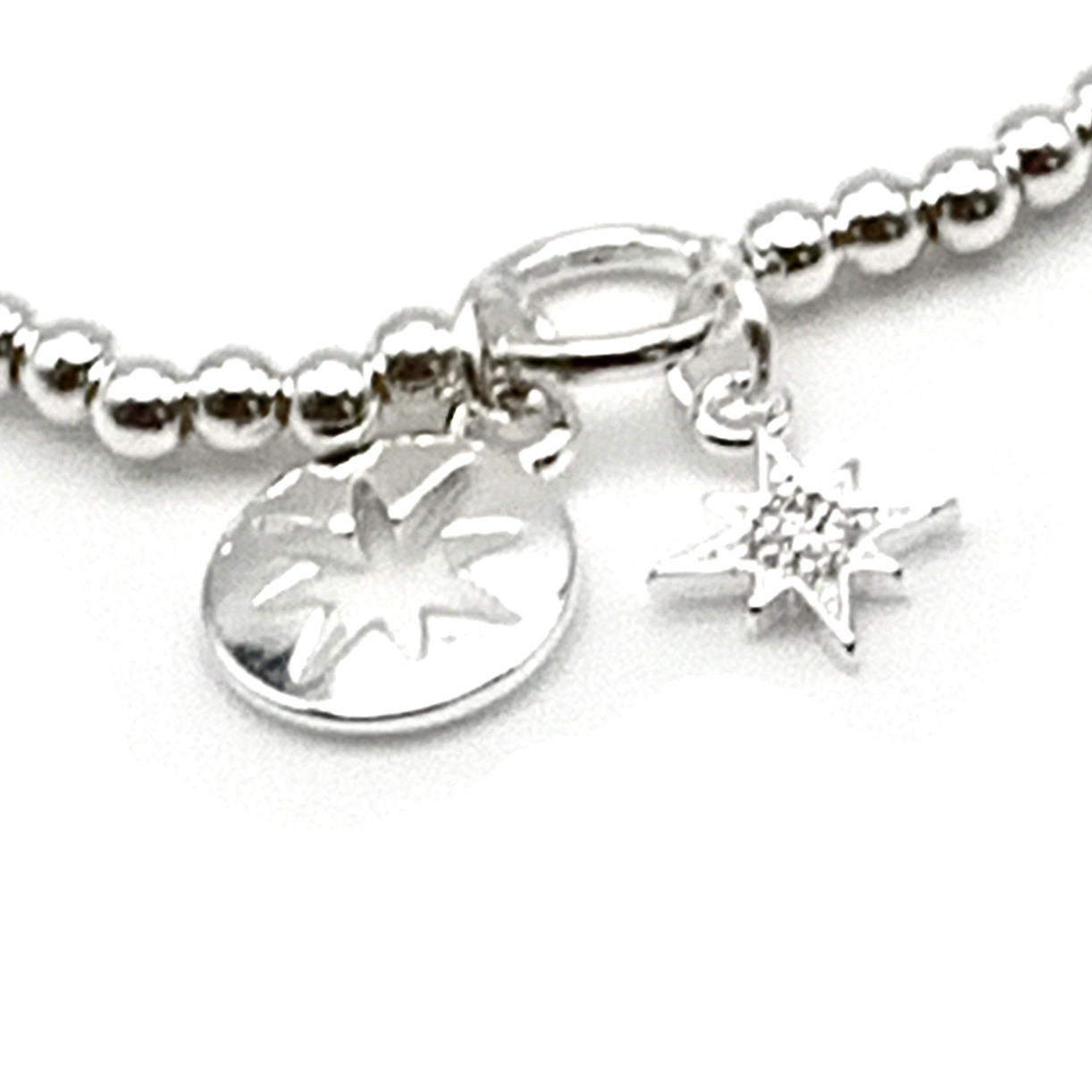 Adorning this delicate chain are two charming 8-point Star of Bethlehem charms: one an intricate cut-out disc, and the other a smaller, solid star. Both are a testament to hope and guidance, making this bracelet more than just an accessory. It's a personal talisman that brings a sense of calm and direction to your day. The sleek silver finish ensures this piece will be a versatile and cherished addition to any collection.
