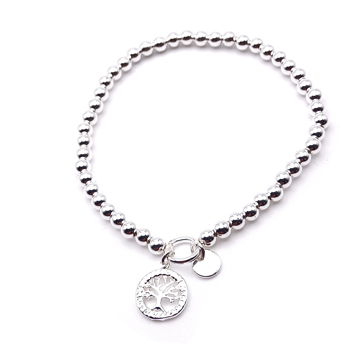 Embrace the symbolic power of the Tree of Life with this stunning and meaningful bracelet. Crafted on a comfortable, stretchy elastic, it's designed to fit any wrist with ease. The bracelet is adorned with a continuous stream of polished silver-plated ball beads that catch the light beautifully, providing a classic and elegant base for the charms.